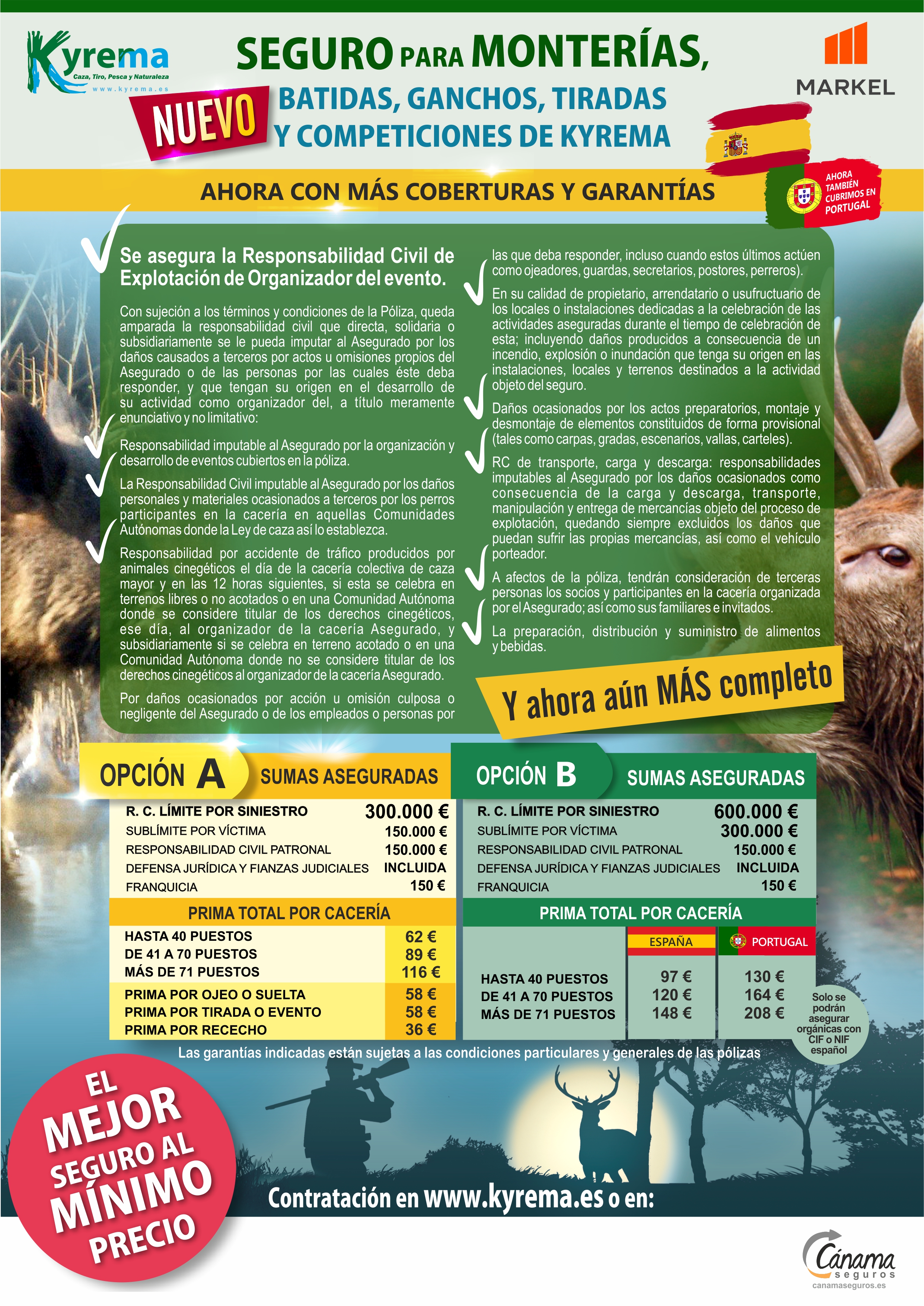 En Cánama Seguros - Kyrema, le ofrecemos el seguro más completo y económico para monterías, batidas, ganchos, tiradas y competiciones. Diseñado específicamente para organizadores de eventos cinegéticos, cubre todas las responsabilidades y riesgos que pueden surgir durante la jornada de caza, con las mejores garantías y el respaldo de MARKEL.